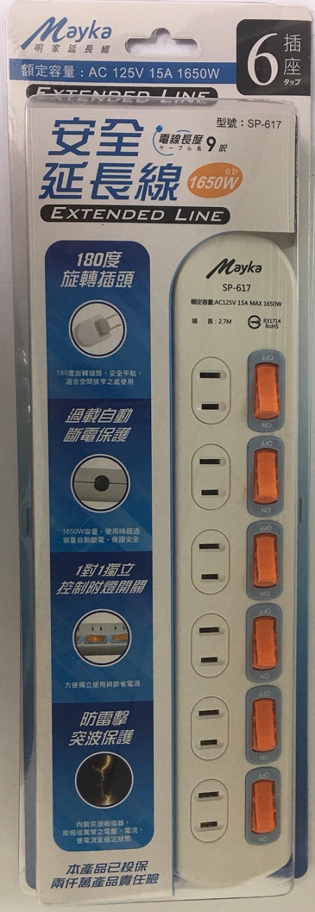 ◆商品名稱:明家安全家用延長線6開6插2.7M