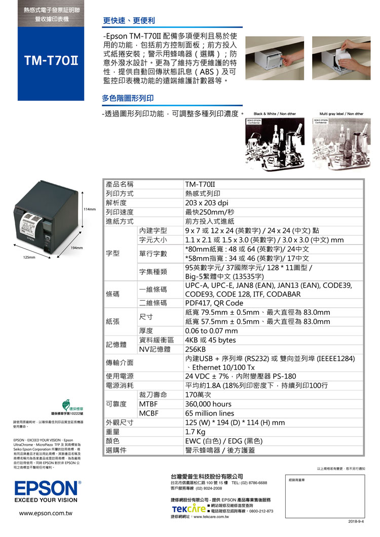 EPSON TM-T70II-904(5.7cm)熱感式電子發票明聯暨收據印表機