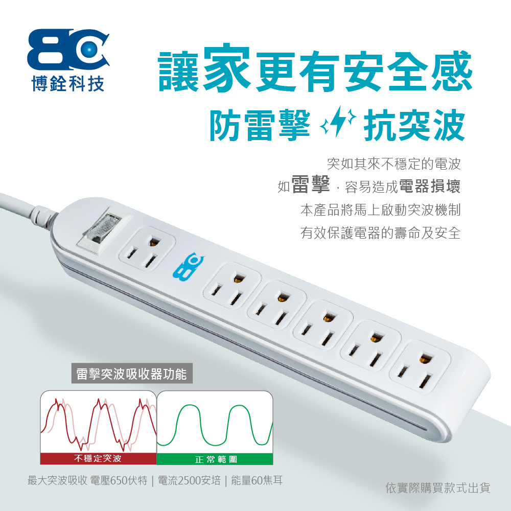 【BC博銓】KTC-318A 防雷擊15A/4.5M/一開六插3孔 90度插頭